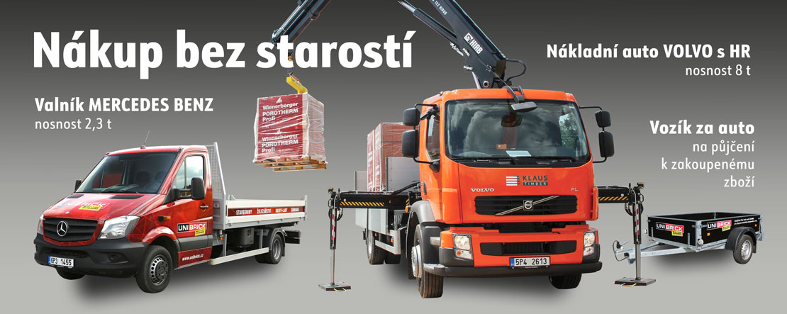 Jakékoliv zboží dopravíme až k Vám domů. K odvozu drobnějšího materiálu slouží valník Mercedes Benz s nosností 2,3 t a ložnou plochou 2,1x3,6 m. Větší objemy materiálu přepravíme nákladním autem VOLVO s HR rukou s nosností 8 t a ložnou plochou 5x2,5 m. Kromě toho Vám v případě potřeby zapůjčíme vozík za auto k zakoupenému zboží. VOLVO s HR rukou nabízíme i pro externí závozy mimo UNIBRICK.