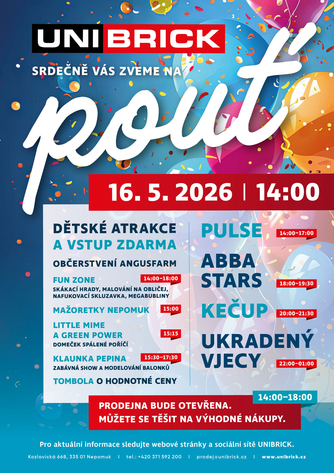 Máme radost, že vás můžeme opět pozvat na Pouť v UNIBRICKU! Uskuteční se v sobotu 16. 5. 2026 v areálu nepomucké prodejny.